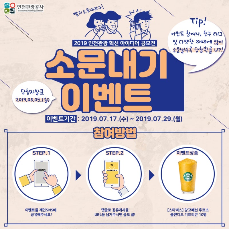 10월에는 서면 지역에서 서면축제가 열린다. 친구들에게 서면축제 소식을 알리고 선물도 받아가세요! 소문내기 이벤트에 참여해주신 분들 중 추첨을 통해 100명에게 네이버페이 이용권 5,000원을 드립니다~ 이벤트 기간 2023. 9. 27.(수) ~ 10. 4.(수)(8일간) 방법 참여하기 STEP 1 부산진구 공식 SNS 팔로우 (블로그, 페이스북, 인스타그램, 카카오스토리) STEP 2 개인 SNS에 이벤트 게시물 게시 필수 해시태그 #서면 #서면페스티벌 공유 STEP 3 인증샷을 네이버폼 https:// naver.me/5PsRnk9w