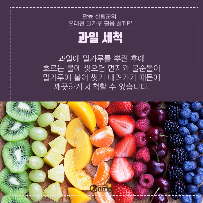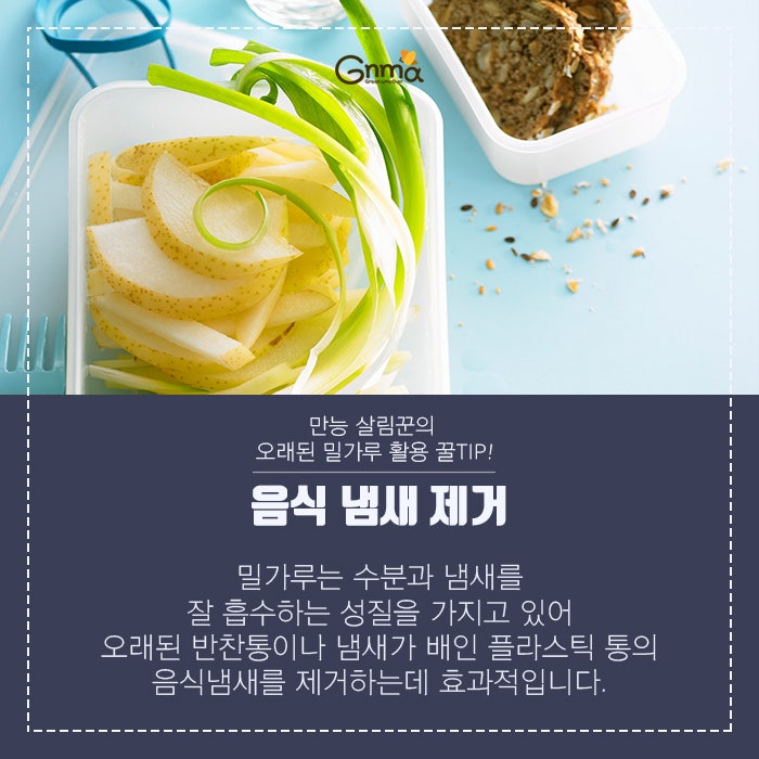 김치는 한식에 빠질 수 없는 음식이지만, 냄새가 쉽게 사라진다는 단점이 있다. 김치가 담긴 용기에 다른 음식을 담을 때 냄새가 나지 않아 보관하기 어렵다는 사실을 한 번쯤 경험해 보셨을 겁니다. 이런 경우에는 밀가루를 이용하면 문제를 해결할 수 있습니다. 먼저 밀가루를 희석한 물을 준비하고, 밀가루를 희석한 물에 음식냄새가 남아있는 반찬용기를 1~2시간 정도 담가두면 냄새가 완전히 제거됩니다. 김치 냄새가 가득한 반찬통 때문에 고민이셨다면 이 레시피를 꼭 시도해 보세요. 지금까지 밀가루를 활용하는 다양한 방법을 알아봤습니다. 이제 남은 밀가루를 버리지 말고, 머리가 아프지 말고, 밀교수님이 알려주신 방법으로 밀가루를 활용해 보세요.