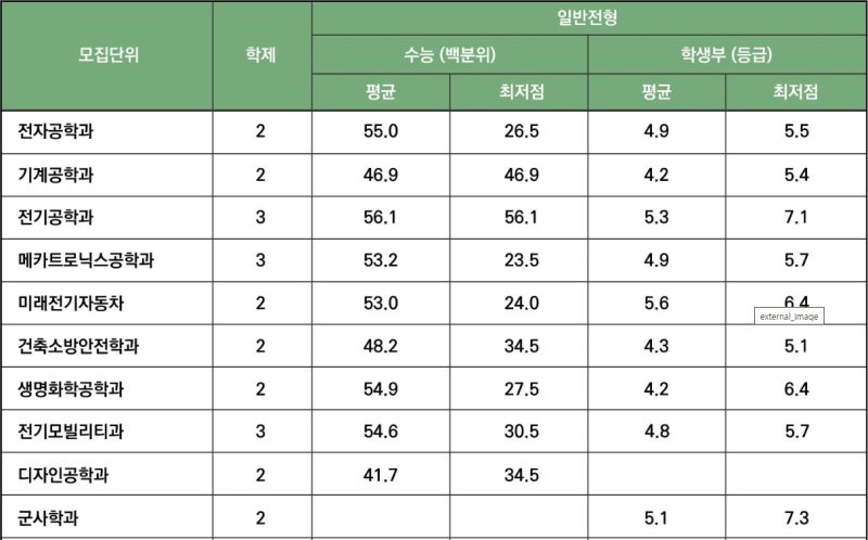 전문대학의 정규전형 전형은 대학에 따라 다소 다릅니다. 대부분의 대학이 수능점수를 반영하지만, 학생성적도 반영하는 대학도 있고, **학생성적을 100%** 반영하는 대학도 있습니다. 수능점수 : 수능점수는 국어, 수학, 영어, 탐구(1과목) 등의 성적을 기준으로 평가합니다. 수도권 대학은 3개 영역(국어, 수학, 영어, 탐구과목) 성적을 반영하는 경우가 많은 반면, 지방대학은 2개 영역(국어, 수학, 영어 중 1개 영역과 탐색과목 1개)만 성적을 반영하는 경우가 많다. 반영되는 경우가 많습니다. 일부 대학에서는 한국사 성적을 추가로 고려할 수도 있습니다. 학생 성적: 많은 대학에서는 학생 성적의 일정 비율을 반영합니다. 예를 들어 **학생성적 40%**와 대학입시성적 60%를 기준으로 선발하는 대학도 있고, **학생성적 100%**를 반영하는 대학도 있습니다. 성적은 1학년부터 3학년까지의 교과 성적을 기준으로 평가하며, 특히 2학년과 3학년의 성적이 중요하게 반영되는 경우가 많습니다. 기타 선발 방법 : 일부 대학에서는 실무능력과 면접 등을 추가 평가 항목으로 활용합니다. 때때로 그들은 그것을 요구합니다. 예를 들어 간호학과, 디자인학과 등 전문학과에서는 추가적인 실기시험을 실시할 수도 있습니다.